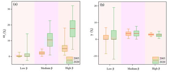 The indirect impact of urbanization in 2005 and 2020 is shown in Figure S3; the negative impacts (wi < 0) were almost presented over the urban intensity of 0~0.5, whereas the positive impact (wi > 0) significantly increased non-linearly with urbanization intensity (slope > 0, p < 0.05), and could be as high as over 19%. The growth enhancement offset (γ) exhibited a trend of first increasing and later decreasing, and gradually stabilizing with the increasing urban intensity, with values of about 2.26% and 2.71% of the growth offset on average in 2005 and 2020, respectively (Figure S3). We additionally found that the relatively higher offset mainly occurred in low and medium urban intensity areas. Subsequently, we further classified urban intensity into low urbanization (β from 0 to 0.3), medium urbanization (β from 0.3 to 0.6), and high urbanization (β from 0.6 to 1), and then compared the magnitudes of the indirect impact on vegetation growth at different urbanization levels in 2005 and 2020 (Figure 9a). The results showed that the average indirect impact (wi) in areas with high urbanization levels was highest (~11.87%), obviously higher than the medium and low urbanization levels. The indirect impact was near zero or even negative in low β levels, though positive impacts also exist. By contrast, there was the highest offset growth (~3.47%) in medium urbanization level compared to urbanized and rural areas (Figure 9b). Both indirect impact and offset growth on FVC became gradually stronger from 2015 to 2020, especially wi in the high β level, but the offsetting growth in high β areas was slightly weaker in 2020 than in 2005.