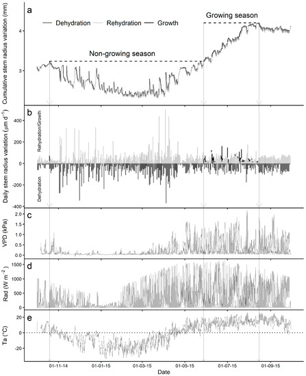 (a) Annual pattern of cumulative stem radius variation with 15 min intervals (mm) and (b) daily stem radius variation (µm day−1) associated with growth and tree water status variations (dehydration and rehydration) for Tree 104 in 2014–2015, and (c) mean daily vapour pressure deficit (VPD), (d) solar radiation (Rad), and (e) air temperature (Ta) over the same period.