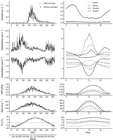 Individual cumulative hourly variations in stem radius associated with stem radial growth, dehydration, and rehydration were then calculated, and the average seasonal (winter: DJF; spring: MAM; summer: JJA; autumn: SON), monthly, daily, and diel dynamics over the entire period are reported.