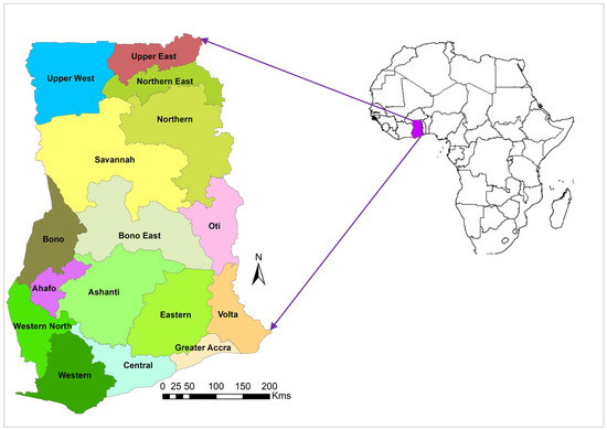 Geopolitically, Ghana is a country in the west of sub-Saharan Africa that lies between latitudes 4°44′ and 11°15′ N and longitudes 3°15′ W and 1°12′ E, with a land area of 238,539 km2 [31]. Ghana is bordered northwards by Burkina Faso, eastwards by Togo, westwards by the Ivory Coast, and southwards by the Atlantic Ocean. The current population of the country is estimated at 30.8 million people, with a population growth rate of about 2.2% per annum [32]. Contemporarily, Ghana has sixteen administrative regions (Figure 1).