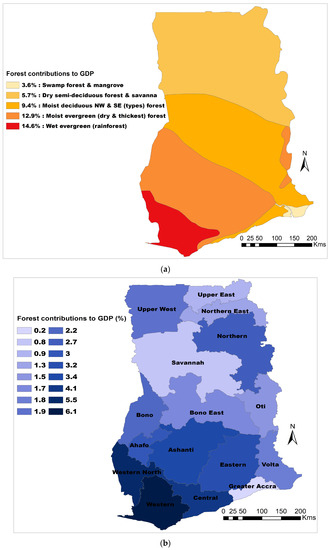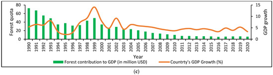 The results showed that during the study periods, forest contributions to GDP vary between the forest–vegetation belts and regions. For example, wet evergreen (rainforest) (14.6%) and moist evergreen (12.9%) forests had the highest contributions to GDP, while dry semi-deciduous forest and savanna (5.7%) and swamp forest and mangrove (3.6%) recorded the lowest contributions to GDP (Figure 3a). In terms of regions, the west and southern regions (such as Western, Western North, Ahafo, Ashanti, Eastern, Central, and Bono) accounted for the regions with the highest forest contributions to the national GDP (Figure 3b). In 1990, forest contribution to GDP was USD 72.35 million, which was higher than the total contributions from 2010 to 2020 summed together (Figure 3c). However, there has been fluctuations in the country’s GDP growth, yet the lowest percentages were recorded in the immediate past decades. In addition to serving as a direct source of export-timbers that enriches Ghana’s economy, the evergreen forests provide shade to livestock, food, and cash crops, thus influencing farmers’ adoption of cocoa agroforestry and integrated crop–livestock–forest systems [48]. The decline in forest contributions to GDP is probably attributed to the decrease in forest area during the period. Many studies have affirmed the impact of forest loss on its contribution to GDP [49,50,51]. In Cameroon, for instance, a study reported that reduction in deforestation was successful in minimizing CO2, but the trade-off effect was a relatively low forestry’s contribution to GDP [49]. In India, some studies have demonstrated that frequent vegetation loss by fires and grazing claimed about 16% of the total forest area, which has influenced species diversity and economic development [52,53]. Consistent with the findings from this work, other studies have reported a huge decline in the forest area in Ghana [54], a situation that has negatively impacted forests’ quota in terms of the nation’s economic growth [54,55]. A study in Japan by Wen et al. [56] analyzed seven bioeconomy sectors with the aim of establishing the leading contributing sectors to GDP. They found that forestry and forest-related products have significant contributions to the country’s GDP.