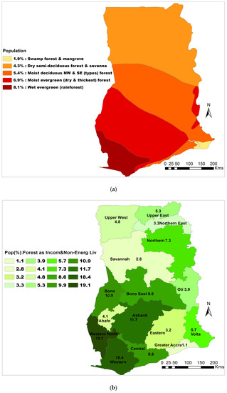 Ghana is one of the countries in sub-Saharan Africa (SSA) that has been known for large hectares of forest areas. There are five dominant forest–vegetation belts, namely, wet evergreen rainforest, moist evergreen (dry and thick) forest, moist deciduous (NW and SE types) forest, dry semi-deciduous forest and savannah, and swamp forest and mangrove (Figure 2). The wet evergreen rainforest and the moist evergreen (dry and thick) forests are found in the south and south-west, while the swamp forest and mangrove vegetation are predominantly in the south-east. On the other hand, the moist deciduous (NW and SE types) forest and the dry semi-deciduous forest and savannah are commonly found in the central and northern regions of the country, respectively (Figure 2). The country is among the SSA countries that have a rapid deforestation rate per year. In 2020 alone, the country recorded more than 14,000 hectares of forest loss [33]. Generally, Ghana is characterized by a tropical climate with distinct wet and dry seasons [34,35]. The country experiences temporal and spatial temperature variations depending on seasonal changes and ecological zone. The mean annual temperature is generally high—above 24 °C. Mean annual rainfall is about 736.6 mm, and rainfall generally decreases from the south to the north [36]. Economically, the GDP growth of the country is 3.3%, with an inflation rate of 29.8% and an unemployment rate of 13.4% [37,38]. Currently, over 3.4 million people in Ghana are living in extreme poverty on less than USD 1.90 per day, with the majority of them living in rural areas [38].