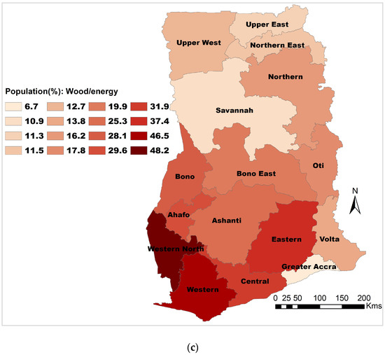 The study further observed that 8.1% of the population use the rainforest and its resources as sources of income and livelihood, whereas the swamp forest and mangrove had only 1.9% of the population depending on it (Figure 4a). With respect to regions, a higher percentage of the population depends on forests for income, livelihood, and bioenergy in the south as compared to either the east or northern regions of the country (Figure 4b,c). Generally, the findings from this study showed that people, particularly in the rural communities, rely on the forests to eke out their livings. Consistent with these findings, other studies on the global level also revealed that about 1 billion of the world’s poorest people depend on forests for their livelihoods [57,58]. Moreover, in the tropical developing countries, the potential of forest and its associated products in supporting people’s livelihoods, especially among the poor rural dwellers, has also been observed by many researchers [59,60,61,62,63,64]. In Zambia, for instance, forest provided 70% of the country’s energy needs [65]. The study also observed that forest supplies rural people with varieties of wild foods including nutritious vegetables, mushrooms, and edible insects. They revealed that at the national level, forests provide revenue for the government from taxes, fees, royalties, and other charges levied on forest-based activities. The study concluded that although forests have an important poverty mitigation function, they are not a means alone to move most people out of poverty. Apart from biofuel, forests provide non-wood forest products (NWFPs), which have minimal or zero negative impacts on the forest. These NWFPs sustain the rural people and promote sustainable forest bioeconomy campaign [59]. The roles of forests in supporting, maintaining, and satisfying rural consumption; diversifying their incomes; and meeting their basic needs are extremely important, especially for those experiencing transient poverty [64]. However, local people, out of poverty and being left with no other options, engage in the cutting of trees for energy, a practice which in most cases goes against their wishes, considering the other numerous benefits they derive from forests [66]. Meanwhile, in some cases, the local people collect deadwood and/or tree branches only. Studies have shown that in most developing countries, the governments and the richer citizens are culprits for large areas of deforestation [60,61,62,63]. In Cambodia, for example, deforestation for timber has been reported as a primary driver of ‘shadow state’ activities that operate through illicit, corrupt, and patrimonial networks of state authorities [60].