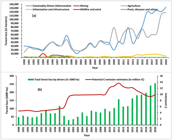Forest loss (in hectres) from 1990 to 2020 by (a) individual drivers and (b) combination of all the drivers and carbon emission estimate.