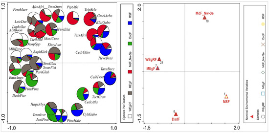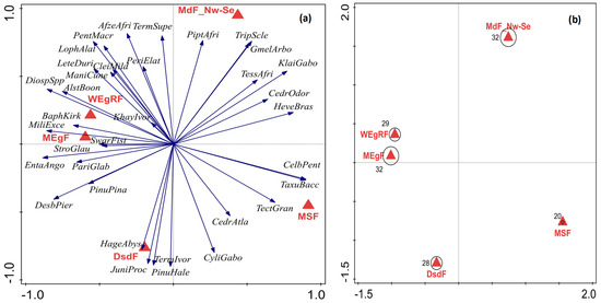 Biplot from the multivariate analysis of ordination showing the forest–vegetation belts with (a) their associated common tree species that promote sustainable forest bioeconomy and (b) the total number and distribution of tree species for each forest–vegetation belt. Description of the abbreviations are as follows: for the species: Diospyros spp. = DiospSpp, Pentaclethra macrophlla = PentMacro, Letestua durissima = LeteDuri, Lophira alata = LophAlat, Milicia excels = MiliExce, Baphia kirkii = BaphKirk, Cleistanthus mildbraedii = CleiMild, Cylicodiscus gabonensis = CyliGabo, Desbordesia pierreana = DesbPier, Manilkara cuneifolia = ManiCune, Parinari glabra = PariGlab, Strombosia glaucescens = StroGlau, Swrtzia fistuloides = SwarFist, Tessmania Africana = TessAfri, Klainedoxa gabonensis = KlaiGabo, Afzelia africana spp. = AfzeAfri, Piptadeniastrum africanum = PiptAfri, Triplochiton scleraxylon = TripScle, Gmelina arborea = GmelArbo, Juniperus procera = JuniProc, Pinus halepensis = PinuHale, Pinus pinaster = PinuPina, Cedrus atlantica = CedrAtla, Hagenia abyssinica = HageAbys, Taxus baccata = TaxuBacc, Hevea brasiliensis = HeveBras, Celba pentandra = CelbPent, Alstonia boonei = AlstBoon, Khaya ivorensis = KhayIvor, Pericopsis elata = PeriElat, Terminalia superba = TermSupe, Terminalia ivorensis = TermIvor, Entandrophragma angolense = EntaAngo, Cedrela odorata = CedrOdor, Tectona grandis = TectGran. For the vegetation zones: wet evergreen rainforest = WEgRF; moist evergreen (dry and thick) forest = MEgF; moist deciduous (NW and SE types) forest = MDF_Nw-Se; dry semi-deciduous forest and savannah = DsdF; and swamp forest and mangrove = MSF.