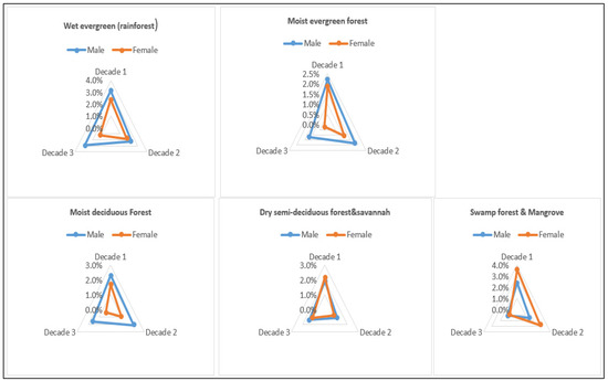 The study indicated that employment rate in forestry and the forest-based sector as an indicator of sustainable forest bioeconomy decreased with time. In the evergreen forest, 5.5% (3.1% male, 2.1% female) of the population were employed in decade 1, and 4.1% for decades 2 and 3 (Figure 10). In all the forest belts, decade 1 recorded the highest percentages of persons employed in forestry and the forest-based sector when compared with decade 2 and decade 3. In Cameroon, for instance, a study reported that reductions in deforestation was positive in the reduction of atmospheric CO2, but led to a decrease in employment in the forestry sector and forestry’s contribution to GDP [49]. In truth, a decrease in deforestation will lower carbon emissions, but inevitably the economic consequences are negative because the contribution of forest to GDP and employment will reduce. To ameliorate this unacceptable scenario, the government and stakeholders in Ghana should fully adopt the Reducing Emissions from Deforestation and Degradation (REDD+) initiatives or some other financial rewarding systems such that the economic losses incurred in reducing deforestation and carbon emission could be compensated as in the cases of Brazil, Costa Rica, and Colombia [90,91].