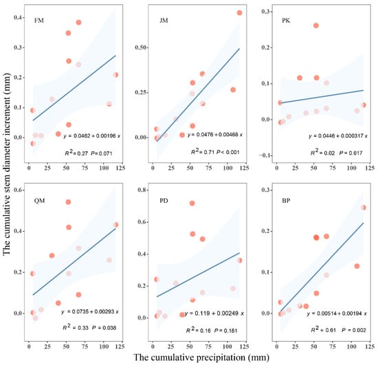 The stem diameter increment of the six tree species was correlated with cumulative precipitation, but the significance of the correlation varied with tree species (Figure 2). The results of correlation analysis showed that the increment of stem diameter of JM (R2 = 0.71, p < 0.001), QM (R2 = 0.33, p = 0.038) and BP (R2 = 0.61, p = 0.002) had a significantly positive correlation with cumulative precipitation, while FM (R2 = 0.27, p = 0.071), PK (R2 = 0.02, p = 0.617) and PD (R2 = 0.16, p = 0.181) was not significantly correlated.