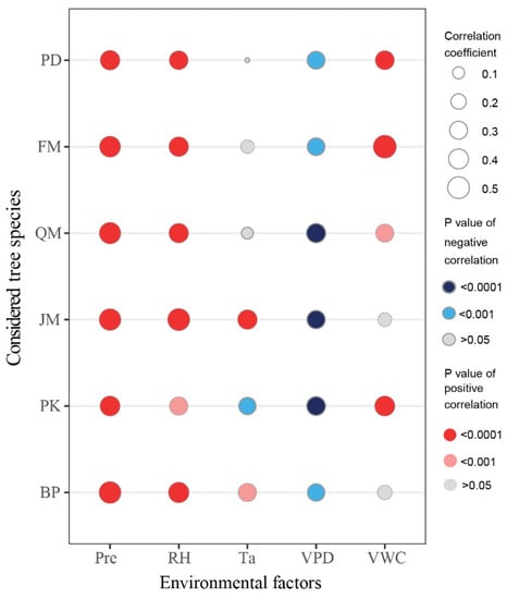 There was significant correlation between the stem radial variation (SRC) of stems and the water condition characteristics (Figure 3). The results showed that the stem radial change (SRC) of six tree species during the growing season (DOY121-273) had a significant positive correlation with precipitation (p < 0.001) and relative humidity (p < 0.001) and had a significant negative correlation with VPD (p < 0.001).