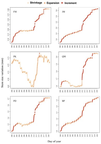 Based on a stem-cycle approach, the typical diurnal cycle can be divided into three distinct phases as follows: (a) contraction phase, the period of shrinkage of the stem radius from a morning maximum to a daily minimum; (b) recovery phase, from the daily minimum to the position observed at that morning’s maximum; (c) stem radial increment (SRI) phase, from when the stem radius exceeds the morning maximum until the subsequent maximum [].