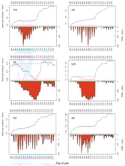 The variation patterns of stem diameter shrinkage of the six tree species under different water conditions were inconsistent (Figure 5). The TWD of the six tree species during seasonal drought (DOY205-211) was significantly higher than that during periods with sufficient water (DOY212-218). The maximum TWD value of QM, PD, PK, JM, BP and FM was 0.26 mm, 0.17 mm, 0.12 mm, 0.06 mm, 0.06 mm and 0.03 mm, respectively.