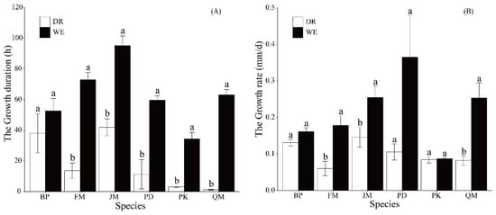 Comparison of growth duration (A) and growth rate (B) of six tree species during different periods. DR represents the period of seasonal drought (DOY205-211) and WE represents the period of sufficient moisture (DOY212-218). FM: Fraxinus mandshurica; JM: Juglans Mandshurica Maxim.; PK: Pinus koraiensis Sieb. et Zucc.; QM: Quercus mongolica Fisch.; PD: Populus davidiana Dode.; BP: Betula platyphylla Suk. Different lowercase letters indicated significant difference at 0.05 level.
