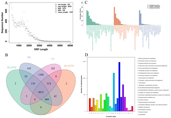 Basic information and annotation analysis of full-length transcripts. (A) ORF length distribution. (B) Comment result Venn diagram. (C) GO enrichment analysis of full-length transcripts for cellular component, biological process, and molecular function. (D) KOG annotation analysis of full-length transcripts.