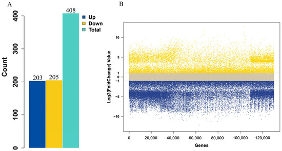 Statistics of the DEGs. (A) Number statistics of the DEGs. There were 408 DEGs, of which 203 were significantly up-regulated and 205 were significantly down-regulated in FGW. (B) Differential multiple distribution of the DEGs.