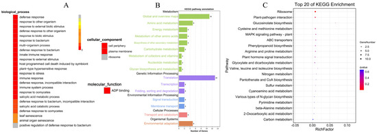 The GO analysis showed that the DEGs were summarized into three categories: biological process, cellular component, and molecular function. Among them, 24 GO items were significantly enriched in the biological process, and the top three were defense response, response to other organism, and response to external biotic stimulus, respectively. They were enriched in three GO entries in the cellular component, including cell periphery, plasma membrane, and ribosome. They were only significantly enriched in ADP binding in the molecular function (Figure 3A).