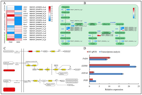 It was found that “Phenylpropanoid biosynthesis” was significantly enriched in the KEGG enrichment analysis. It is well known that lignin synthesis is related to “Phenylpropanoid biosynthesis”. We identified the genes in the lignin biosynthesis pathway and found that key enzymes, such as phenylalanine ammonia-lyase (PAL), 4-coumarate CoA ligase (4CL), cinnamoyl-CoA reductase (CCR), shikimate hydroxycinnamoyl transferase (HCT), caffeic acid O-methyltransferase (COMT), and peroxidase (PER), were differentially expressed (Figure 4B).