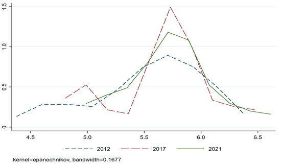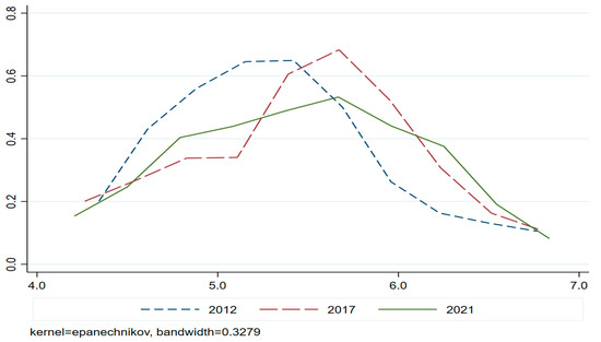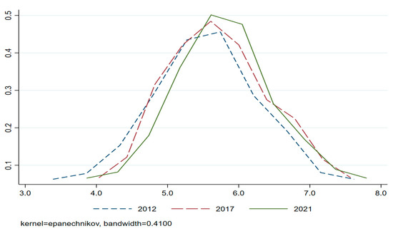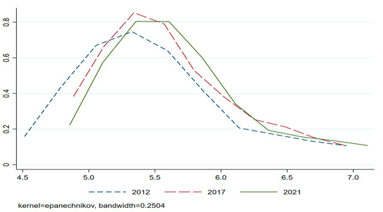Kernel density estimation belongs to the class of weight functions for the local approximation approach, where a kernel estimator for the density function is obtained by using a weighted average of the local observations of the weight function. The common kernel density estimate is shown in Equation (11) [28]. In Equation (11), n is the number of observations, denotes the specific observation, denotes the mean value of the observation, and denotes the kernel density function. is the bandwidth, and a sensitive parameter that controls the accuracy of the kernel density estimation. In general, a smaller bandwidth leads to more flexible kernel density estimation and smoother curves, but poorer estimation accuracy. Additionally, the optimal width is the width that would minimize the mean integrated squared error [28]. In practice, scholars typically compare the central positions, wave crests, curve widths and trailing of kernel density maps at different times in order to analyze the development trend and absolute difference evolution of a phenomenon, such as agricultural drought frequency analysis and convergence analysis of basic public service supply [29,30]. In this paper, we used Stata 16.0 to produce kernel density estimates and graph the results, in which was the Epanechnikov kernel and the optimal bandwidth was calculated and used by the system automatically.