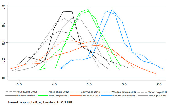 Table 7 lists the mean values and annual growth rates of the international competitiveness index for other forest products in the observed countries from 2012 to 2021. Figure 4 shows the kernel density distribution curve of international competitiveness for other forest products in the observed countries from 2012 to 2021, in which the same color curve represents the kernel density curve of the same forest product during different times.