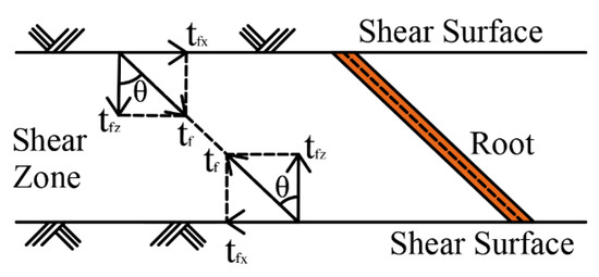 The tensile stress of roots could be decomposed into the normal stress and tangential stress on the shear surface of the soil, where the normal stress enhanced the friction strength on the shear surface, and the tangential stress could be directly involved in resisting the shear deformation of soil on both sides of the shear surface.