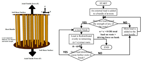 Pollen and Simon [34] proposed a fiber bundle model (Figure 2) based on stress redistribution, considering the dynamic movement of roots’ tensile force and progressive fracture of roots during the deformation process of root-permeated soil. Schwarz et al. [36] developed a fiber-reinforced model that controlled the loading process by displacement by establishing the relationship between tensile force and tensile displacement of roots (Equation (3)). However, the fiber bundle model assumes that the driving force of the soil and the stress of the broken root from the newly distributed stress were all transferred to the roots in root-permeated soil and ignores the important root–soil interaction. It is suitable for the case that the driving force is mainly axial force, such as the instability of river embankment, the sliding of the back edge of a slope sliding mass, etc.