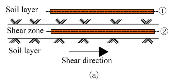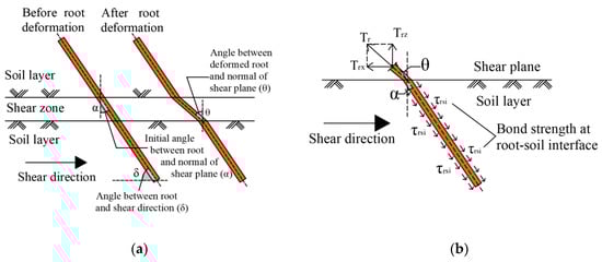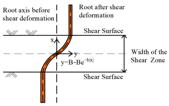 Abe et al. [50] and Fan et al. [32] established a displacement-based model (Equation (4)) for estimating the shear resistance of root-permeated soils considering the deformation characteristics of roots in the shear zone (Figure 3). The accuracy of displacement-based model calculation depends on the accurate fitting of the root deformation function in root-permeated soil. However, it is difficult to accurately observe the root deformation in in situ tests or laboratory tests. In addition, the parameters of the model are complex and difficult to obtain, so it is rarely used to evaluate the strength of root-permeated soil under different application scenarios.