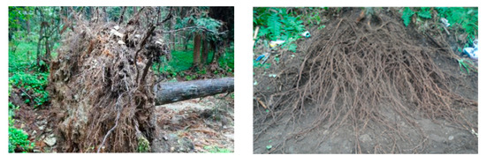 The selected study area was located in Longchi National Forest Park (103°11′38″–103°52′16″ E, 31°4′40″–31°17′37″ N, altitude 520–3280 m) in the Longxi River Basin at the junction of the Western Sichuan Plain and the Qinghai-Tibet Plateau. The study area belongs to the subtropical monsoon climate zone. The annual distribution of rainfall is very uneven, concentrated from May to September, with heavy rainfall intensity and high frequency. During the rainy season, geological disasters, such as collapse, landslides and debris flow and soil erosion, often occur in the region [51]. Chinese fir is typical vegetation in the study area, which plays a very important role in soil and water conservation and climate regulation [52]. In addition, the main root development of Chinese fir is not obvious, and horizontal scattered roots are more developed (Figure 4). Therefore, the lateral roots of Chinese fir trees in the study area were taken as the research object of the model verification test.