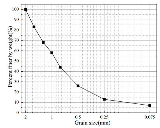 To eliminate the influence of plant humus, the soil below 30 cm in the surface layer at the root sampling site of Chinese fir was selected as the experimental soil material, with a water content of 22% and a dry density of 1.11 g/cm−3. Fine particle content of soil accounted for 7.5%. The plastic limit and liquid limit of particle size less than 0.5 mm were 7.08 and 28.68, respectively. The collected soil samples were dried at 105° ± 5° for 24 h, and then the maximum particle size was controlled to be 2 mm for screening to obtain the dry soil required for the test. According to the measured water content of the soil in the study area, the required water content of the test soil was calculated. The dry soil was graded and gradually mixed with water to ensure a uniform mixing of water and soil. After full stirring, the soil was transferred into the sealed fresh-keeping bag for one night to obtain the test soil with a water content of 22%. The grain-size frequent curve of the test soil is shown in Figure 5.