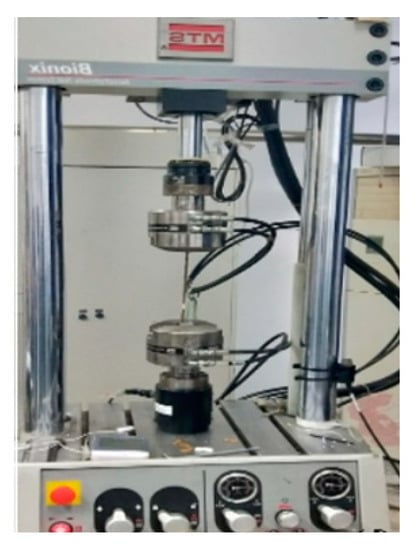 The tensile strength of mechanical parameters of Chinese fir roots was obtained by the uniaxial tensile test. After the root was cleaned, the two ends of the root were processed with cold-embedded epoxy resin to prevent the root from being damaged and skidded in the clamping. The processed root samples were placed in a refrigerator at 4 °C for 48 h for re-hardening. The uniaxial tensile test of roots was carried out under MTS BIonix hydraulic machine (Figure 6).