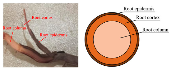 The location and characteristics of the Chinese fir tree sampled from the roots are shown in Table 1. The collected roots were stored in a refrigerator at 4° time. Considering the size limitation of the shear box in the indoor direct shear test, we selected roots with uniform root diameter, good growth and a diameter of 2 mm ± 0.1 mm as the root material used in the verification test. Because the water content has a great influence on the mechanical properties of roots, to reduce experimental error by root water content, the collected and stored roots are carried out under the same environmental conditions.