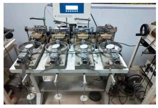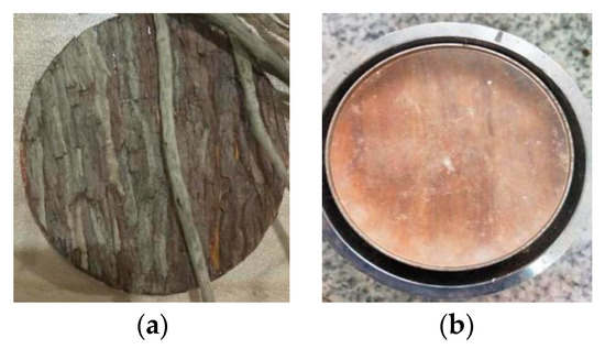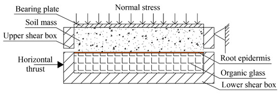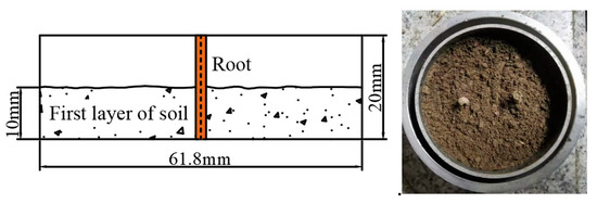 The root epidermis was cut off with roots for experiments where both the epidermis and the cortex were intact (both the epidermis and the cortex were cut off to ensure that the root epidermis was not destroyed) and were glued to a custom organic glass block (Figure 10a). According to the measured dry density of the soil and the size of the shear box, the well-configured test soil was weighed and put into a ring knife with a height of 20 mm and a diameter of 61.8 mm. The organic glass block adhered to the root epidermis was placed on the soil for compaction to ensure the full bonding between the root surface and the soil (Figure 10b). The blank control group was designed, with 4 samples in each group. The specimen number is shown in Table 2. Due to the shallow soil depth, considering the confining pressure of the soil in the actual soil depth, in order to effectively measure the bond strength of root–soil interface, the specimens were sheared at the rate of 0.8 mm/min under the vertical pressure of 25, 50, 75 and 100 kPa, respectively, until the dynamometer reading didn’t change with the increase of shear displacement, and the maximum shear strength of the root–soil interface under each vertical load was obtained.