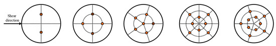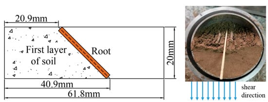 Based on the field investigation of root area ratio RAR (field root investigation results show that the average RAR is around 0.6% in the range of root concentrated growth), the root area ratio on the shear plane was 0.21%, 0.42%, 0.63%, 0.84%, 1.05%, the distribution of roots in the shear box was shown in Figure 11. The δ angle between the root and shear direction was 45° and 90°. According to the measured dry density of the soil and the size of the shear box, the well-configured test soil was weighed and compacted in the ring knife based on the arrangement of roots. When the δ angle was 90° (Figure 12), the half-mass soil required for a sample was weighed for preliminary leveling, compaction and shaving, and the other half of the mass soil was filled around the roots for compaction after inserting the roots through the toothpick socket at the position of the pre-designed root; When the δ angle was 45° (Figure 13), the volume of the test soil which accounts for half of the full ring knife was weighed, compacted and scraped according to the 45° inclination angle of the surface, and the prepared root system was laid, and then loaded into the half of the soil for compaction. The total experimental design group of 10 groups, each group of 4 samples, sample number and parameters as shown in Table 3. The installation and shearing of the prepared specimen of root-permeated soil in the four-way strain-controlled direct shear apparatus were consistent with the shear resistance test of the root–soil interface in list item (2) in Section 3.2
