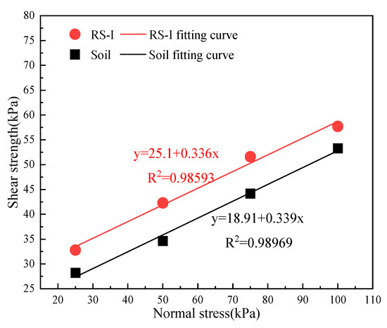 The shear strength test results of soil and root–soil interface under different normal stresses were drawn and linearly fitted in the τ σ coordinate (Figure 14). There is little difference between the internal friction angle of root–soil interface φ r s i and the internal friction angle of the soil φ s o i l . The internal friction angle of root–soil interface φ r s i is influenced by the roughness of soil particles and root surface, root type, soil type, soil particle composition and water content [53]. The close value of φ r s i and φ s o i l is a coincidence caused by these factors. It can be seen from Figure 14 that the root–soil interface bond strength and soil shear strength are positively correlated with the normal stress, and the determination coefficients of the two fitting relationships are almost the same and are greater than 0.98, showing a good correlation. Therefore, the bond strength of the root–soil interface and the normal stress of the interface obey the Coulomb theory, i.e., the bond strength of the root–soil interface τ r s i can be quantified by the strength parameters of the interface cohesion and the interface friction angle (Equation (6)). The strength parameters of soil shear strength and root–soil interface bond strength are shown in Table 6.