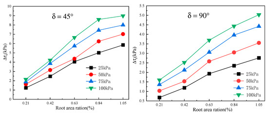 The shear strength of the root-permeated soil under different normal stresses was obtained by direct shear test. The direct shear test results were plotted in the τ σ coordinate, and the shear strength parameters of the specimens were obtained by linear fitting, as shown in Table 7. The shear strength difference between the root-permeated soil and the soil in Table 5 is root reinforcement, as shown in Figure 15.