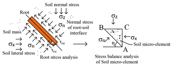 The interface friction force f r s i provides the second part of bond strength for the root–soil interface. When the root and soil move or tend to move each other, the local bulge of the root surface will squeeze the surrounding soil, and the mechanical occlusion between the root and soil interface forms strong interfacial friction. The interfacial friction resistance depends on the interfacial normal stress σ n and the interfacial friction angle φ r s i . The normal stress of the interface is controlled by the stress state of the soil and the angle η between the root and the lateral stress direction of the soil. A micro-unit ABC in the soil was set as a plane stress state, and the normal stress diagram acting on the root–soil interface was shown in Figure 17.