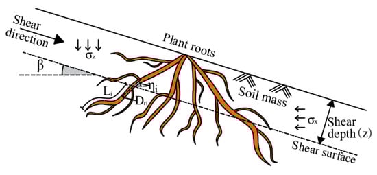 In recent years, due to the impact of climate change, seismic disturbance and human engineering construction, soil erosion, landslides and other disasters frequently occur, which not only cause huge property losses but also seriously threaten the safety of life [1,2]. At the same time, it aggravates the degradation of the ecological environment and leads to an imbalance of the ecological environment. Plenty of studies have shown that the interaction of high modulus and strength plant roots with low modulus and strength soil improves the shear strength and deformation resistance of soil [3,4,5,6]. On the other hand, vegetation can effectively reduce the erosion of surface runoff on slope soil and soil pore water pressure by interception, evapotranspiration and infiltration [7,8,9,10] so as to stabilize soil and improve slope stability. Therefore, vegetation slope protection technology has been widely concerned and applied by many scholars and relevant departments [11,12,13,14,15]. However, the existing roots mechanical reinforcement theory lags behind the use of technology, which is insufficient to guide the implementation of vegetation slope protection technology and evaluate the stability of vegetation slope to a certain extent [16]. In addition, the mechanical reinforcement effect of roots on soil is controlled by multiple factors with spatiotemporal variabilities, such as the number of roots passing through the potential shear surface [17,18], the angle between roots and shear surface [19], root diameters and root lengths [20], the mechanical characteristics of roots [21,22], soil type, confining pressure, and soil moisture [23], and the bonding (include both friction and cohesion) of root–soil interfaces [24]. These influencing factors show significant differences under many external conditions, for example, vegetation species [25,26], fiber strength [27,28], site environment [29], climatic characteristics [30], and groundwater. Consequently, it is of great research value and practical guiding significance to identify the interaction of the root–soil and quantify the mechanical reinforcement of plant roots on soil for the prevention and control of shallow landslides, soil erosion and other geological disasters.