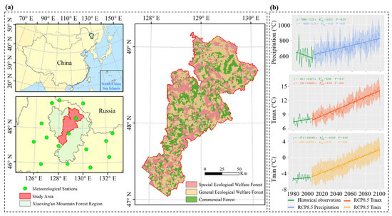 Geographical location and three categories of management zones of the study area (a), and the historical climate observation and future climates projected by the four General Circulation Models (GCMs) under the RCP8.5 scenario (b).