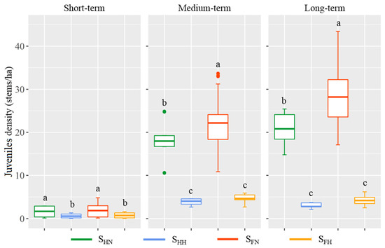 The abundance of Pinus koraiensis juveniles under different scenarios of climate and seed harvesting combinations at the whole region scale in the short, medium, and long term, respectively. Different letters displayed significant differences at the 0.05 level among scenarios as determined by the ANOVA and the Duncan test. SHN, historical climate without harvesting; SHH, historical climate with harvesting; SFN, future climate without harvesting; SFH, climate with harvesting.