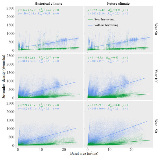 The relationship between the abundance of Pinus koraiensis juveniles and its basal area at the years 50, 100, and 150 under the different scenarios of seed harvesting and climate change combination.