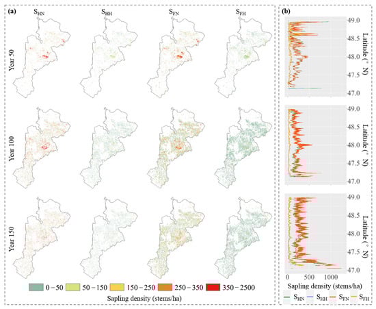 The spatial distribution of the abundance of Pinus koraiensis juveniles under the different scenarios of climate and seed harvesting combinations in 50, 100, and 150 (a); The spatial distribution of the abundance of Pinus koraiensis juveniles along the longitudinal direction under the different scenarios of seed harvesting and climate change combination in 50, 100 and 150 (b). Error bands represented one standard deviation of the abundance of Pinus koraiensis juveniles among scenarios of seed harvesting and climate change combinations. SHN, historical climate without harvesting; SHH, historical climate with harvesting; SFN, future climate without harvesting; SFH, climate with harvesting.