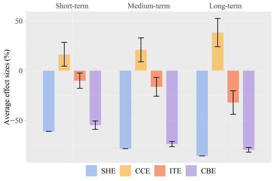 The average effect sizes of seed harvesting (SHE), climate change (CCE), and their interaction (ITE) and combination (CBE) on Pinus koraiensis regeneration in the short-, medium-, and long-term, respectively. Error bars of SHE represented one standard deviation of five replicates, and the remaining bars represented one standard deviation of the combination scenarios of four future climates projected by GCMs and five replicates (20 simulations, 4 climate scenarios × 5 replicates).