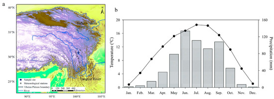 Locations of the sampling site, meteorological stations, (a) and monthly mean temperatures and total precipitation for the study area, which were calculated from 5 meteorological stations (Danba, Luhuo, Jinchuan, Xiaojin, and Daofu) during the period of 1962~2010 (b).