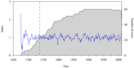 All core samples were pre-processed following the basic international procedures for tree-ring analysis [24,25]. A Lintab system with a precision of 0.01 mm was used to measure the TRW, and the COFECHA software [26] was adopted for cross-dating. Afterward, the ARSTAN program [27] was used for detrending to eliminate non-climatic information contained in the original TRW and retain as much climatic information as possible. By repeatedly fitting the growth trend using different methods, the spline function with a step of 50 years was found to perform best in fitting the growth trend. Finally, we obtained three tree-ring chronologies: standard (STD), residual (RES), and autoregressive standard (ARS) chronologies [27]. Several core samples with large differences from the main series were eliminated in the process of constructing the chronologies. STD chronology was mainly adopted for the analysis. The total length of the chronology was 336 years (1675~2010), and the average sensitivity was 0.158. In the common period of 1900~2000, the intra-tree and inter-tree correlation coefficients were, respectively, 0.604 and 0.208, and the expressed population signal (EPS), signal-to-noise ratio (SNR), and variance explained by the first principal component were, respectively, 0.943, 16.518, and 29.7%. These statistical characteristics of the chronologies indicate that the chronology has the potential to reflect past climate change. EPS > 0.85 was used to determine the reliable interval of the chronology [21,28]. After reaching 21 tree rings, the EPS exceeded 0.85, so the reliable period was deemed to be 1733~2010 (Table 1 and Figure 2).
