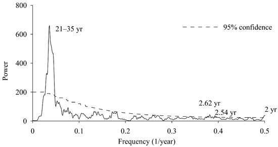 As shown in Figure 6, the results of MTM at a confidence level of 95% indicated that the reconstructed series mainly features an interannual variation period of 2 years and a decadal oscillation period of 21 to 35 years.