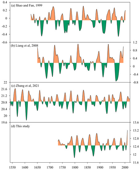 Although few historical climatic events before 1950 can be determined, some clues can still be garnered from historical records to provide evidence for a reconstruction. According to some low-temperature events (snow disasters and freeze-related injuries) in the Sichuan Volume of the China Meteorological Calamity Grand Ceremony [46], there were few low-temperature events, indicating a high-temperature period. Correspondingly, low-temperature events were frequently recorded in the low-temperature period. For example, 1865~1880 was found to be a cold period in our reconstruction. Correspondingly, large-scale snow disasters happened frequently from the 1860s to early 1870s, particularly in 1871, in which snow disasters were most severe: “countless passers-by died, and most cattle and sheep froze to death” [46]. Thereafter, snow disasters occurred frequently from 1890 to 1930, and snow disasters were recorded to happen in counties and cities around the study area in 1913, 1917, and 1922 [46]. This period corresponds to the two continuous cold periods from 1900 to 1911 and 1915 to 1923 in the reconstructed series.