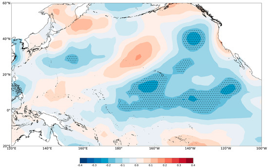 MTM spectral analysis of the reconstruction shows that the reconstructed series included significant periodic changes (Figure 6). Furthermore, wavelet analysis indicated the significant presence of decadal oscillations with a period of 21~35 y, nearly throughout the period analyzed. The interannual periodic changes of 2 y mainly correspond to high-frequency oscillations of the reconstructed series. On the one hand, this result is likely related to the quasi-two-year period commonly present in the climatic system; on the other hand, these changes are consistent with the main period of El Niño–Southern Oscillation (ENSO), indicating that ENSO may have a certain modulating effect on temperature variations in the region. Similar results were also obtained for the reconstructed temperature in the surrounding areas [17,21,50,51]. The decadal periodic oscillation is likely related to Pacific decadal oscillation (PDO), which was verified in numerous studies as one of the main factors controlling decadal climate variability in East Asia [17,52,53]. The reconstructed series has a correlation coefficient of 0.14 with the reconstructed PDO [54] (1733~2004, p < 0.05), indicating that PDO exerts an important influence on the temperature in the study area. Here, when PDO is in a warm phase, the sea temperature in the middle-east equator of the Pacific Ocean is higher, and the location of the ridge point of the western Pacific subtropical high (WPSH) is much more westward. The study area is likely to be controlled by WPSH, with strong downdrafts leading to higher temperatures. Conversely, if PDO is in a cold phase, it becomes conducive to the northward movement of warm and humid air flows, leading to frequent rain and relatively lower summer temperatures in the study area. Studies in the nearby area revealed that PDO is one of the main controlling factors [55,56]. Correlations between the reconstructed series and sea surface temperature (SST) of the Pacific also support this result (Figure 9).