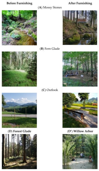 The study was conducted in a community forest located in the Austrian county of Upper Austria, called Hallerwald. This forest covers an area of 270,000 m2 and is used for wood production, education, and recreation. The vegetation corresponds to a mixed forest with areas of spruce monoculture. Forest owners chose four places to be studied. Sites had to represent different stand types and show various characteristics of the forest. Further, they had to be accessible by different user groups, such as people in different phases of life or those with health and mobility restrictions. Therefore, the four places under study were all located near a well-kept forest path and were easily accessible for visitors. These places represented different green and blue spaces, stand type, openness, and biodiversity. The purpose of the local authorities was to enhance the potential of the Hallerwald forest by installing furnishings that not only improve the quality of recreation, but also emphasize the uniqueness of the forest. As such, the aim was to maintain the forest as a recreational space for the local population while also making it accessible for health tourism and sustainable education. In a prior study, we reported on the restorative qualities of unfurnished places in the forest [21].