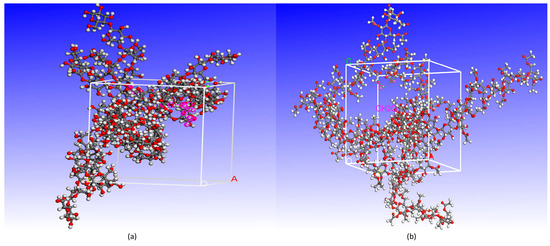 In the microscopic experiments, the cellulose chains with a polymerization degree of 20 are adopted to construct the model of the amorphous region of the molecular structure [17]. Since the cellulose molecule content in the cell is extremely high, the model directly used the density of cellulose as the density of cells, which was set to 1.5 g/cm3 for the cellulose–formaldehyde composite model and 1.3 g/cm3 for the cellulose acetate–forma–dehyde composite model in this paper [18]; considering that multiple molecular chains can only play the role of mutual influence and form the physical environment of opening and closing molecular channels, the composite model is therefore composed of three cellulose chains and four formaldehyde molecules. It is important to note that Mazeau et al. [19] showed that the length size of cellulose chains does not affect the simulation experiments; hybrid modeling using the amorphous cell module of Materials Studio software. The composite model is shown in Figure 1, a for the cellulose–formaldehyde model and b for the cellulose–acetate–formaldehyde model.