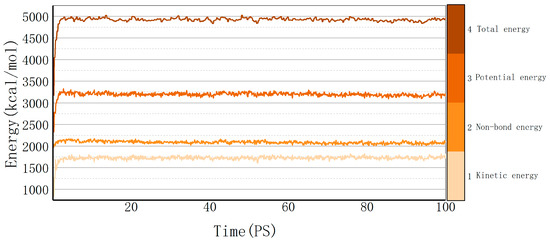 Molecular dynamics explains the energy changes between molecules from a microscopic perspective. If the model system reaches equilibrium, it proves that the intermolecular is in a stable state, and this equilibrium can be observed by temperature and energy fluctuations in the range of simulation time. Taking the cellulose–formaldehyde model as an example, Figure 2 shows that the temperature quickly reaches a steady state as time changes, while the energy changes in more ways; taking the 453 K temperature experiment with the cellulose–formaldehyde composite model as an example, the energy fluctuations are plotted in Figure 3.