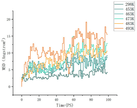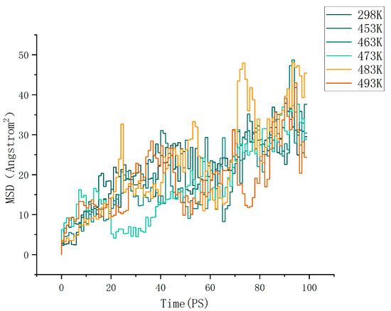 where d is the dimension of the motion space. For normal three-dimensional diffusion, we have d = 3. For Brownian motion on the surface of a liquid, we have d = 2. By calculation, the MSD (mean square displacement) curves of the cellulose–formaldehyde model are shown in Figure 4 below, and those of the cellulose–acetate–formaldehyde model are shown in Figure 5 below.