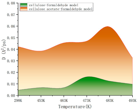 As can be seen in Figure 6, the diffusion coefficient of the cellulose–acetate–formaldehyde model is always higher than that of the cellulose–formaldehyde model, while they both stand out at 483 K versus 493 K.