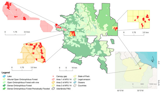 Location of the study areas and gaps and subdivisions of the Annual Production Unit No. 14 (APU-14) of the Forest Management Unit (FMU) at Fazenda Uberlândia, Portel, Pará state.